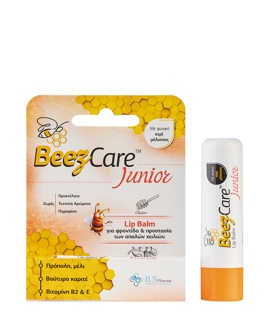 Lip balm BeezCare™ JUNIOR για φροντίδα και προστασία των απαλών χειλιών. Με φυσικό κερί μέλισσας, πρόπολη, μέλι, βούτυρο καριτέ, βιταμίνες B2 και E που θρέφουν τα απαλά χείλη. Τα συστατικά από την κυψέλη διατηρούν την υγρασία στο δέρμα και το προστατεύουν το δέρμα και τα χείλη από την αφυδάτωση.