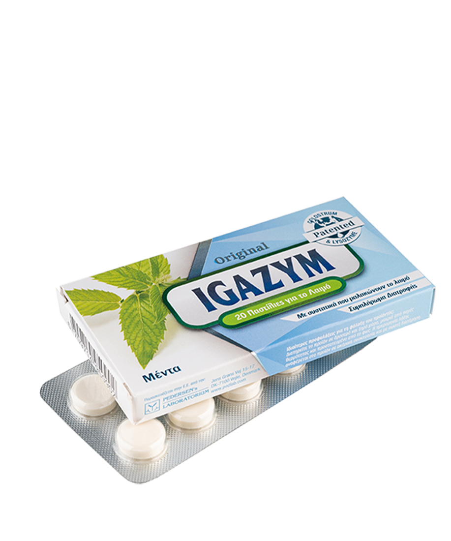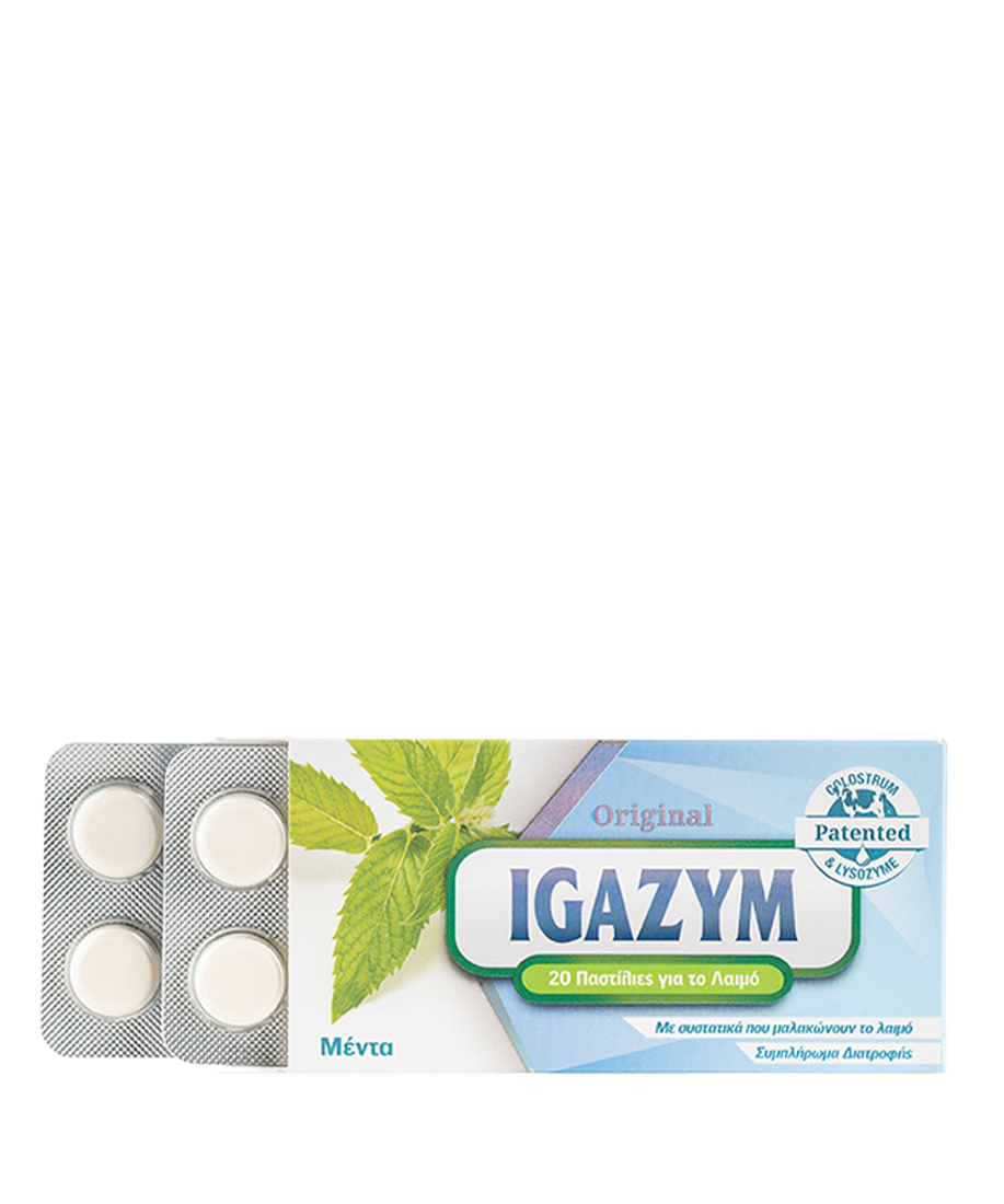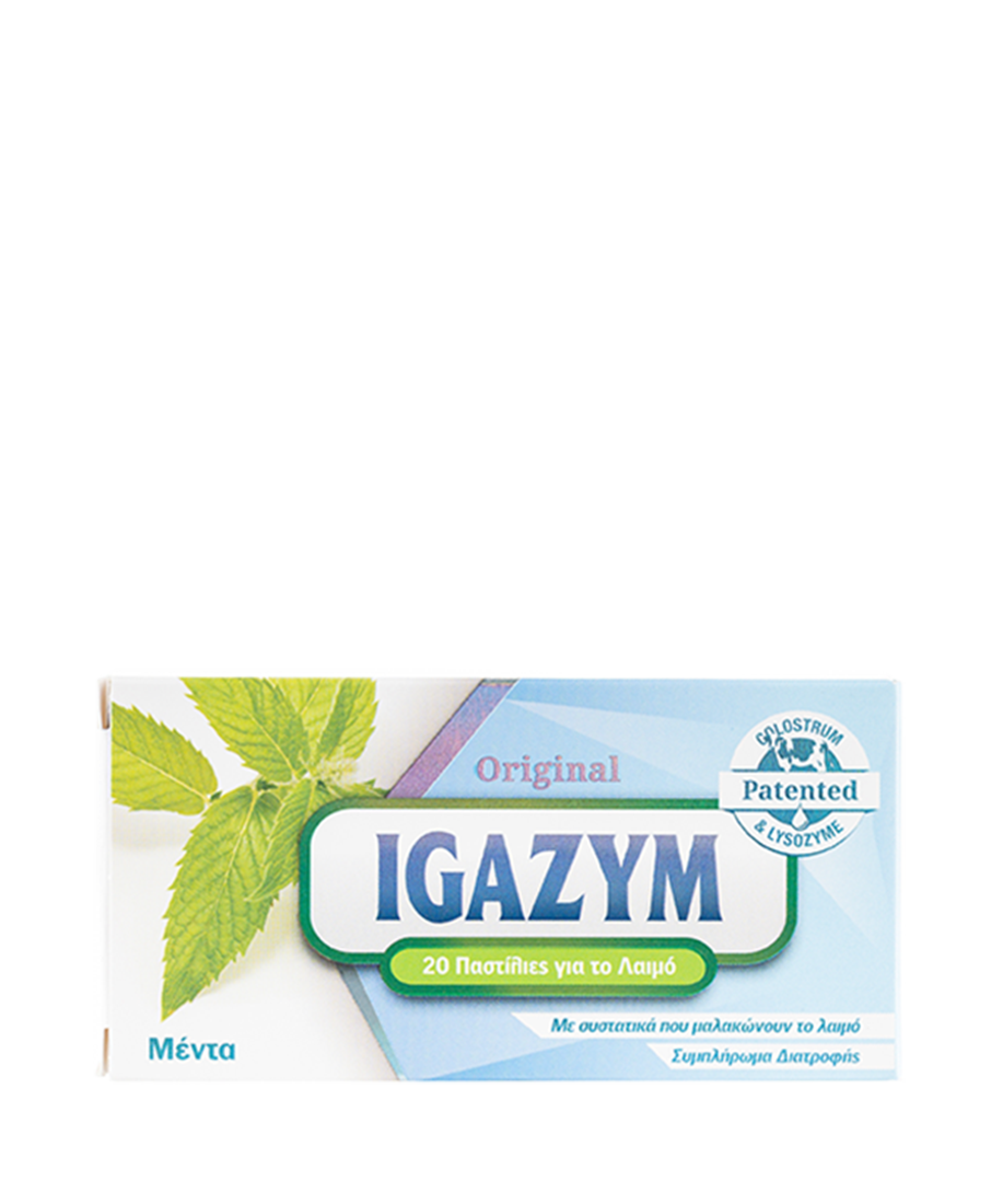 Παστίλιες για το λαιμό IGAZYM με γεύση μέντας. Περιέχουν πρωτόγαλα από αγελάδες, που έχουν μόλις γεννήσει, και ασπράδι αυγού. Μαλακώνουν και καταπραΰνουν τον λαιμό συμβάλλοντας στην καλή λειτουργία του ανοσοποιητικού. Η έντονη γεύση της μέντας δίνει μία αίσθηση φρεσκάδας και δροσερής αναπνοής στο στόμα.